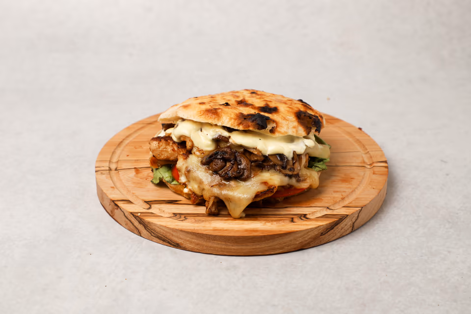 Pil. belo meso, šum.pav. sos, majonez, krastavac, paradajz, salata, sir, gljive