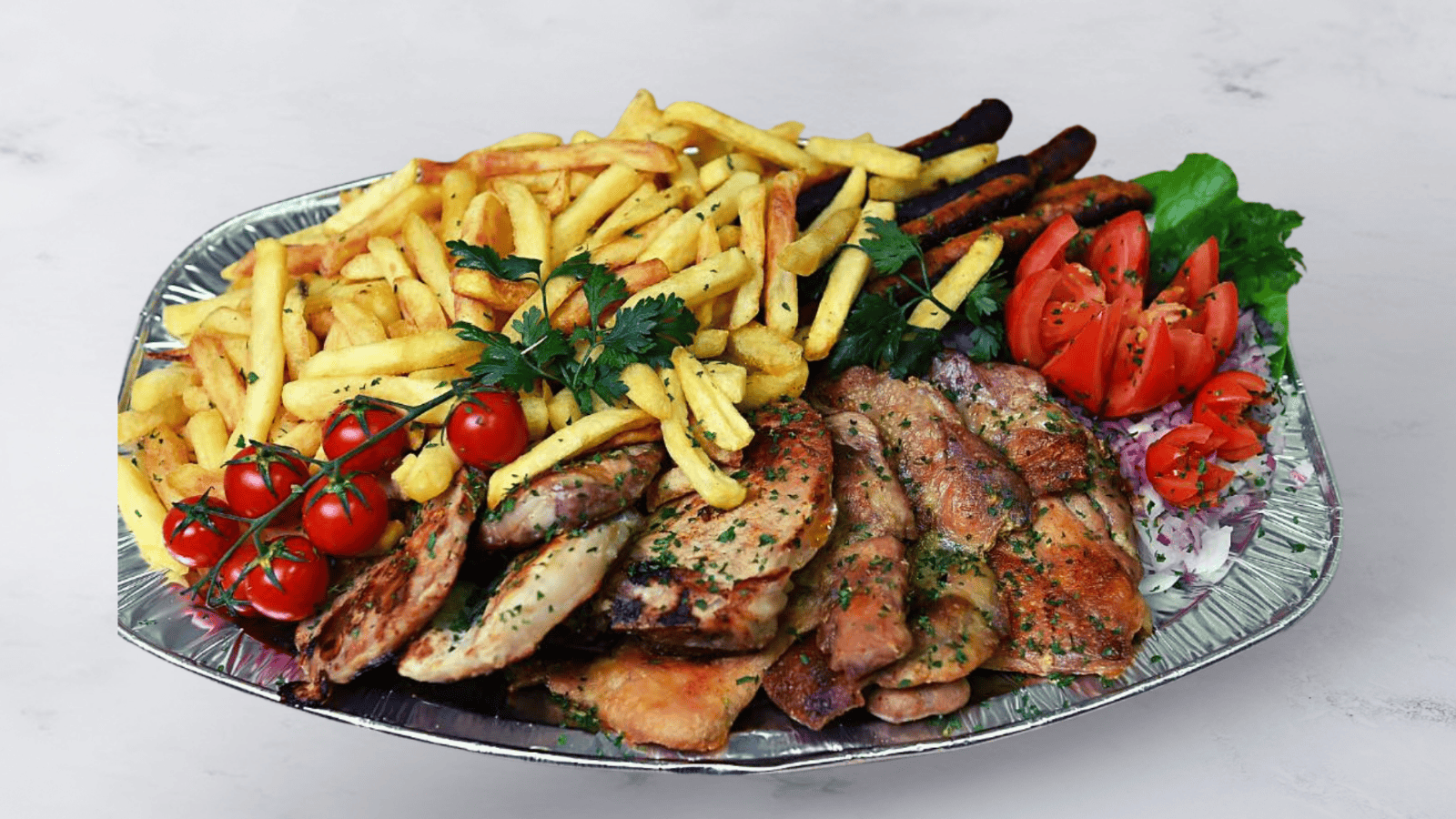 600g svinjskog karea, 600g roštiljske kobasice, 600g pilećih bataka i 1kg krompira
